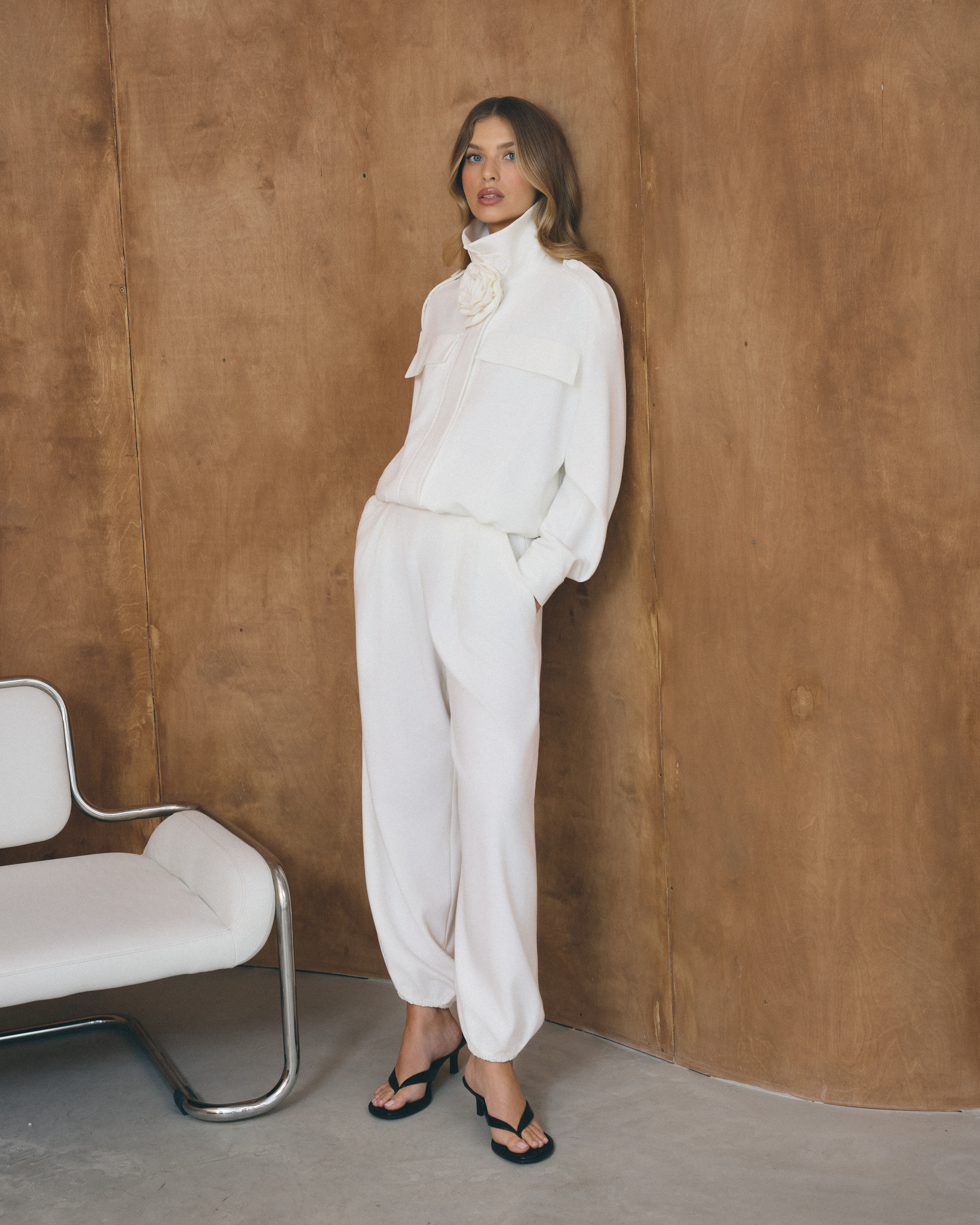 Eleganckie bufiaste spodnie typu baloon w kolorze ecru. Zapinane z boku na zamek błyskawiczny, posiadają kieszenie.