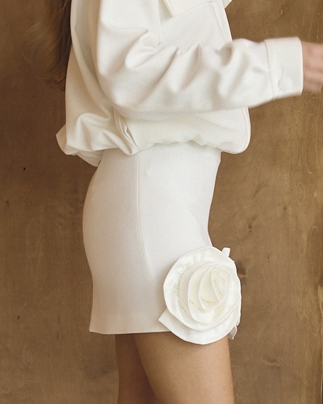Spódnica mini o całkowicie obcisłym kroju, ozdabiana ręcznie układanymi kwiatami 3D na przodzie. Tył projektu jest gładki, zapiany na zamek błyskawiczny. Spódnica wykonana na podszewce.
