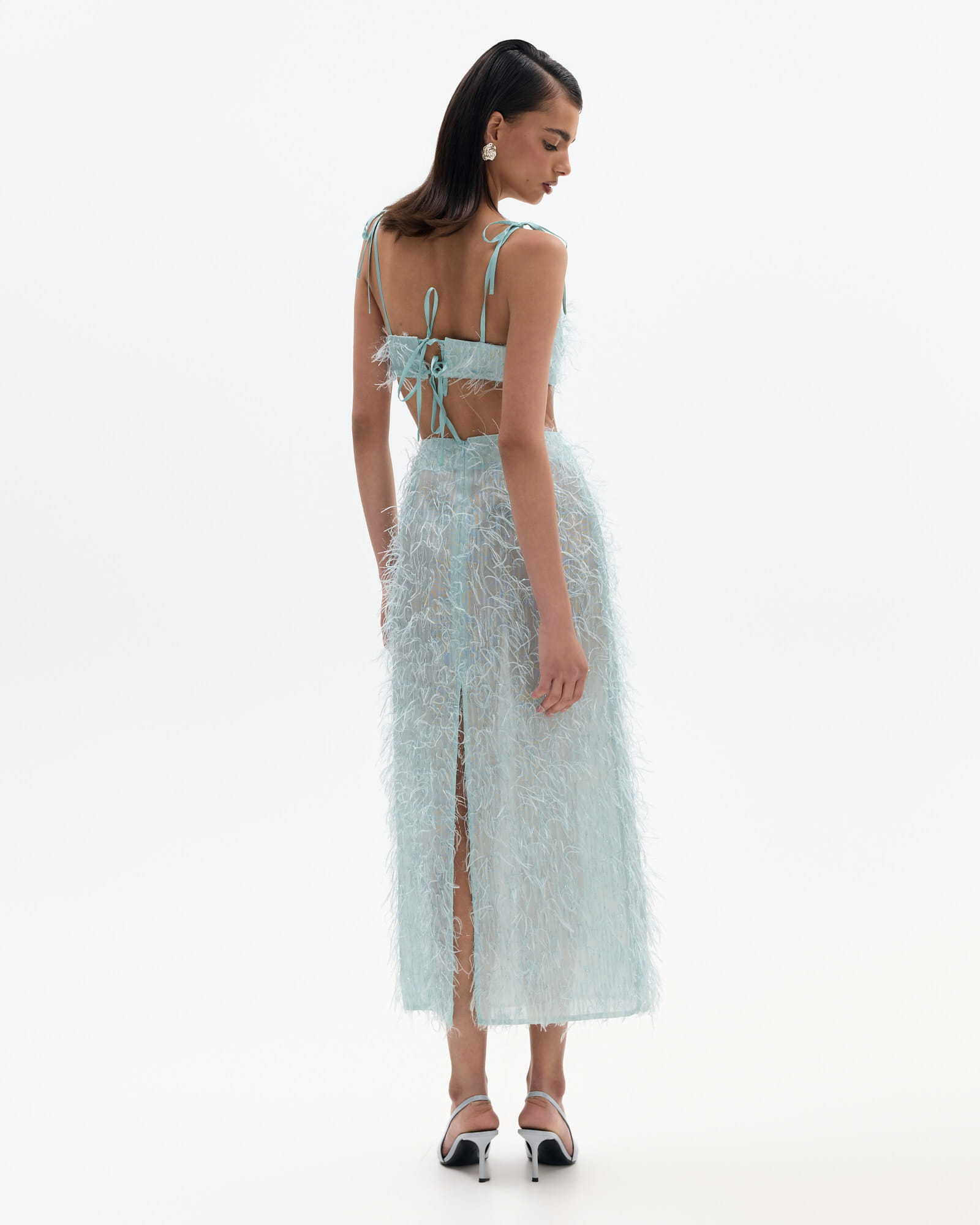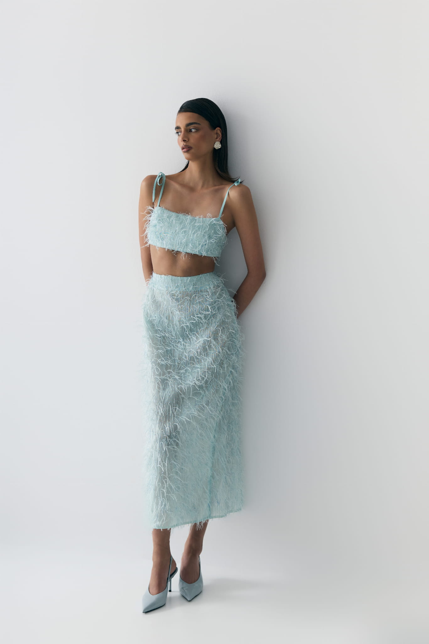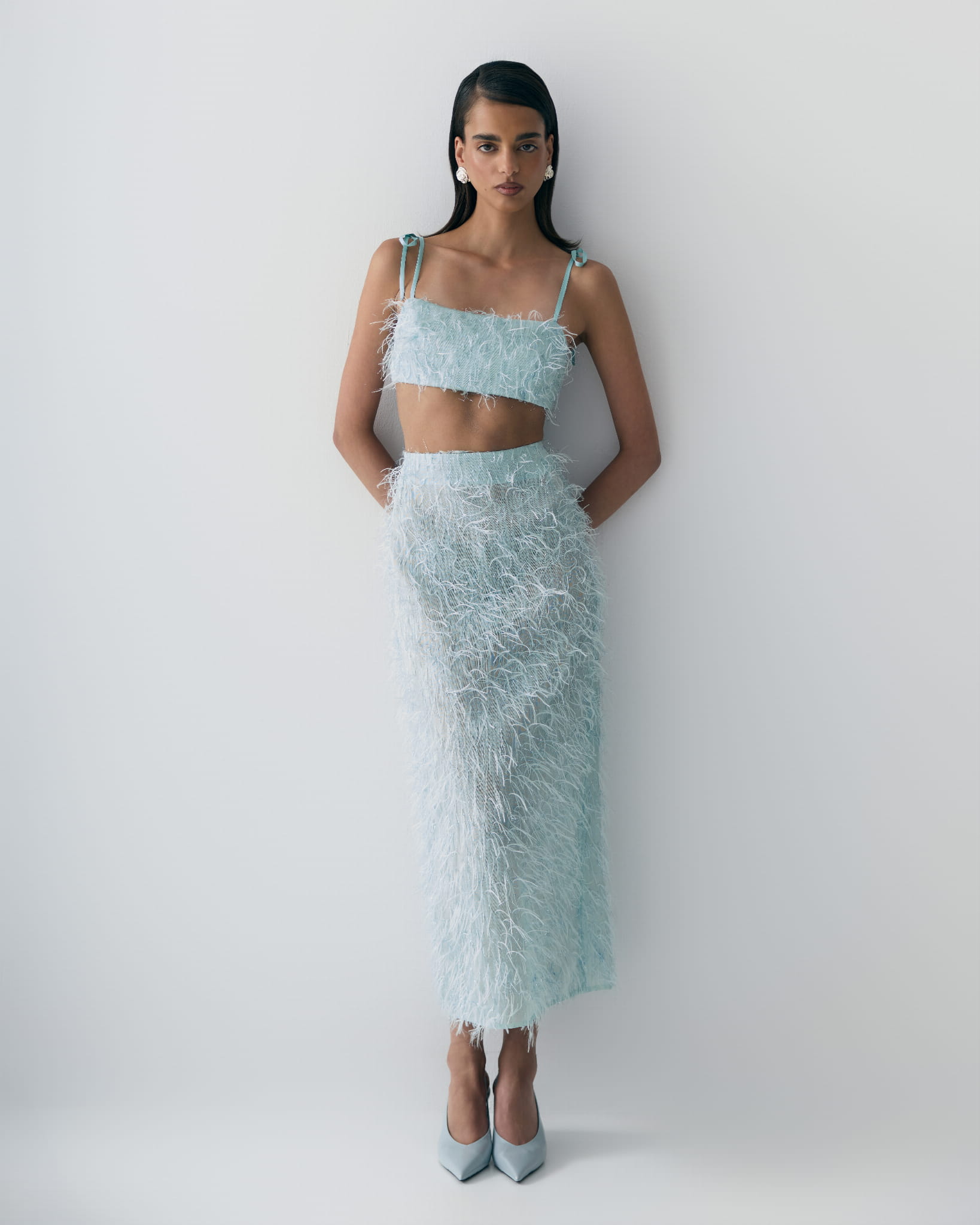 Komplet wykonany z niebieskiej tkaniny ozdobionej frędzlami oraz srebrną nitką. Krótki top wiązany jest na kokardy, tył można regulować troczkami. Spódnica midi o kroju ołówkowym zapinana jest z tyłu na zamek błyskawiczny.