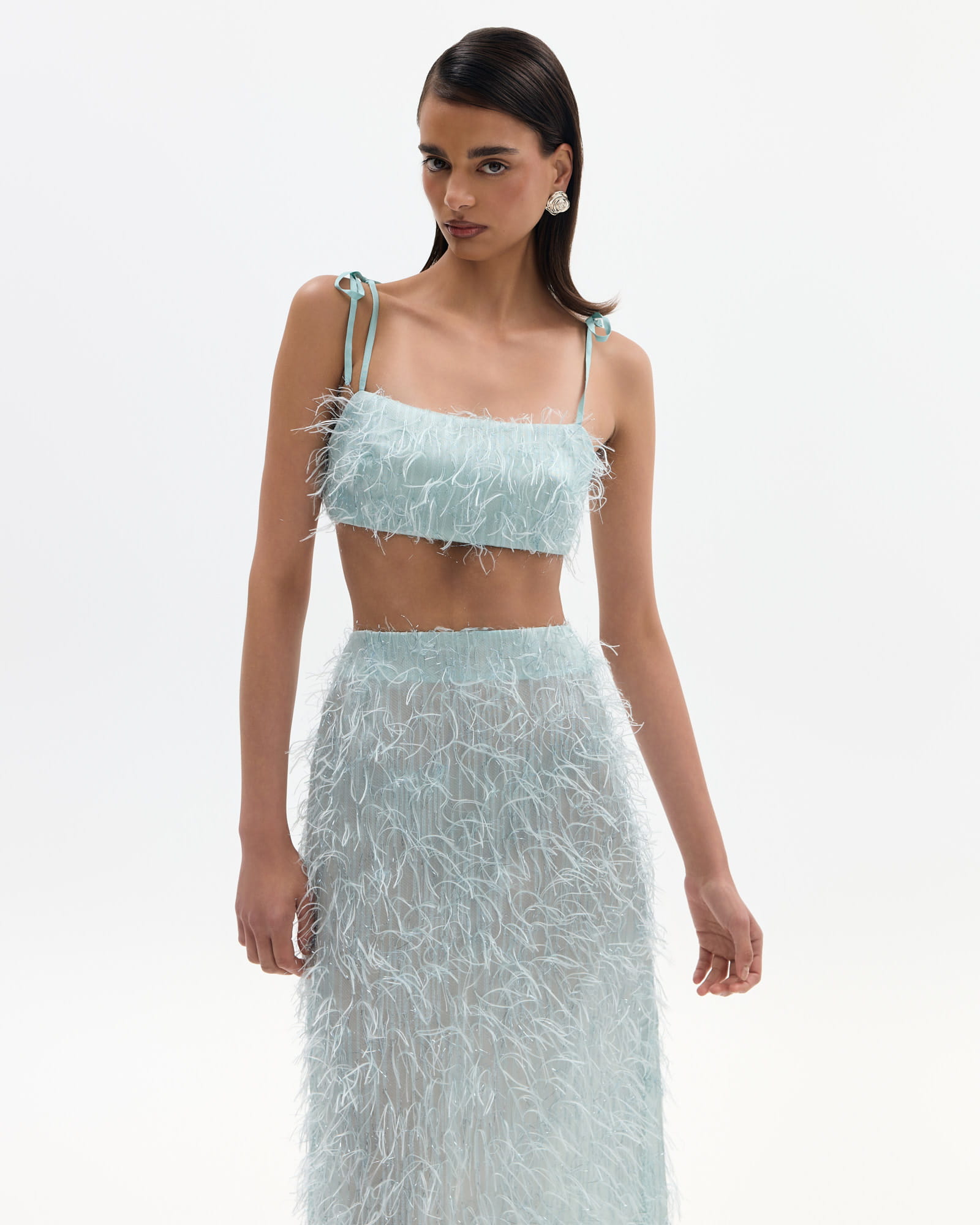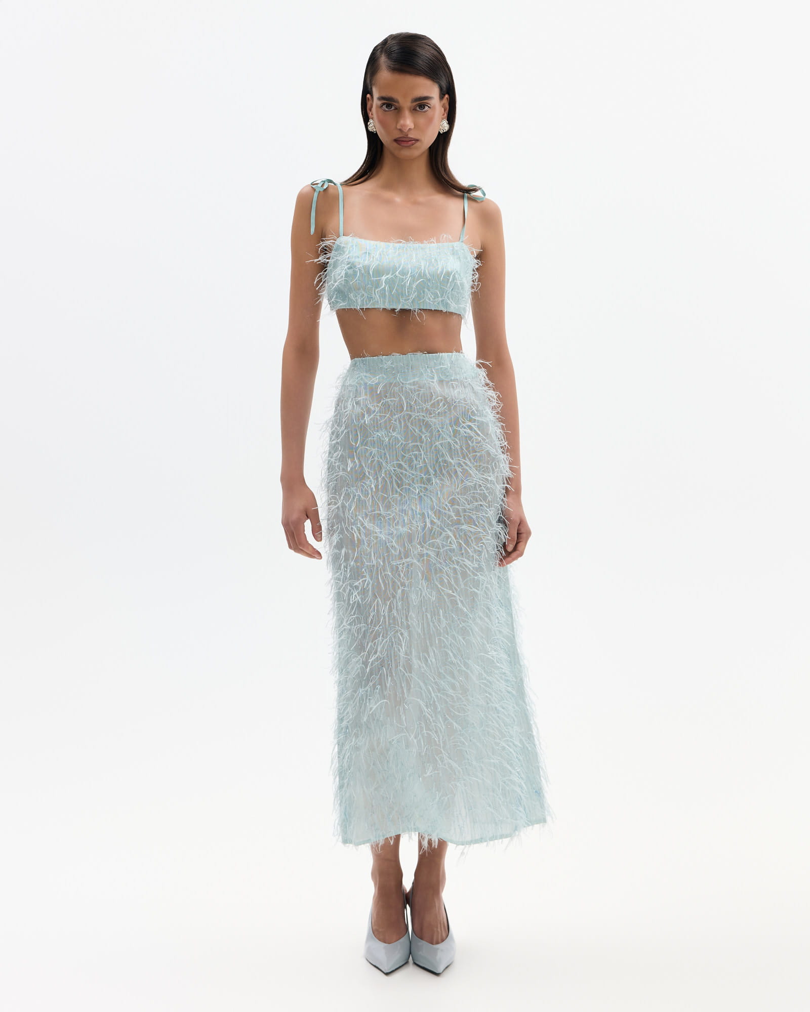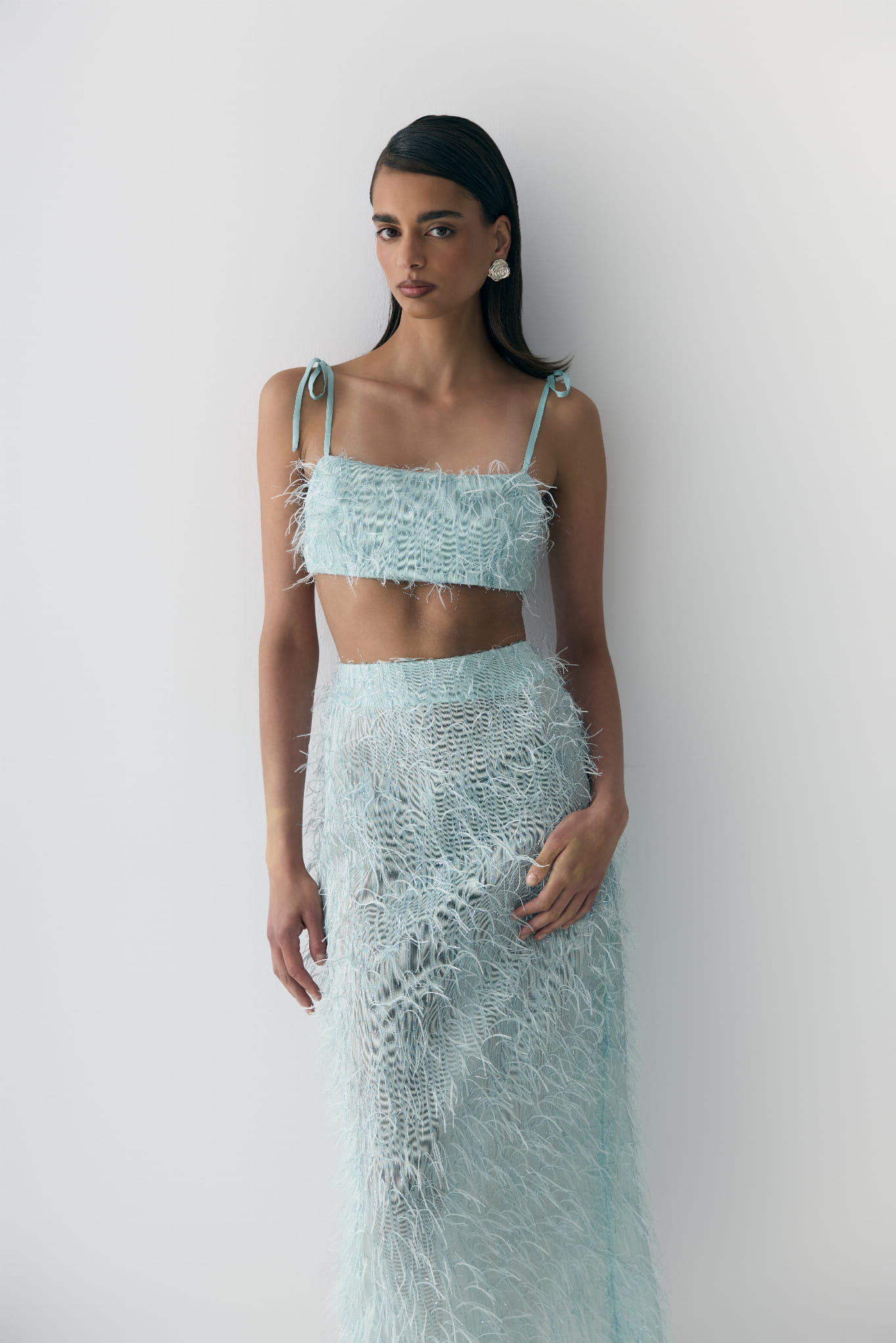 Komplet wykonany z niebieskiej tkaniny ozdobionej frędzlami oraz srebrną nitką. Krótki top wiązany jest na kokardy, tył można regulować troczkami. Spódnica midi o kroju ołówkowym zapinana jest z tyłu na zamek błyskawiczny.