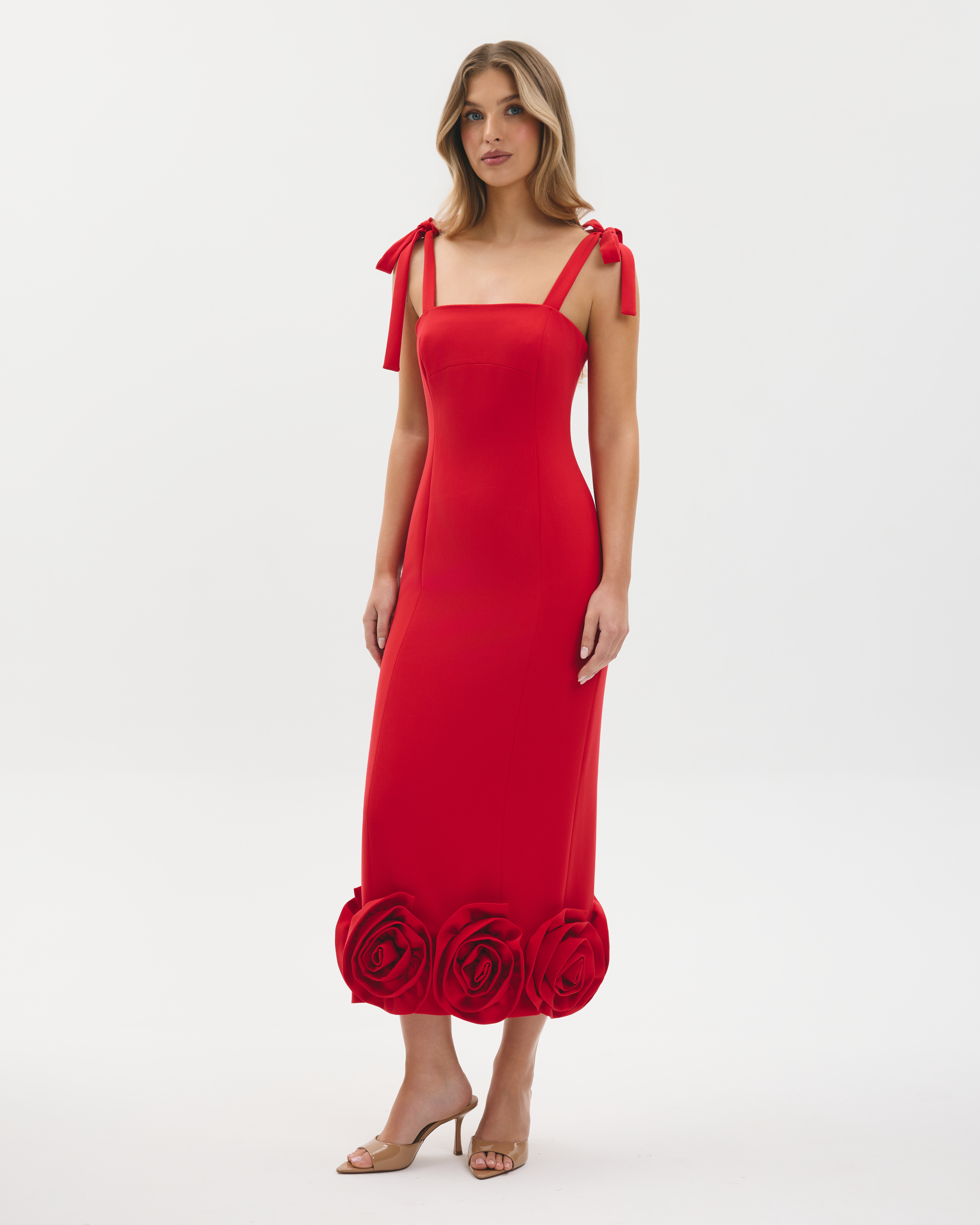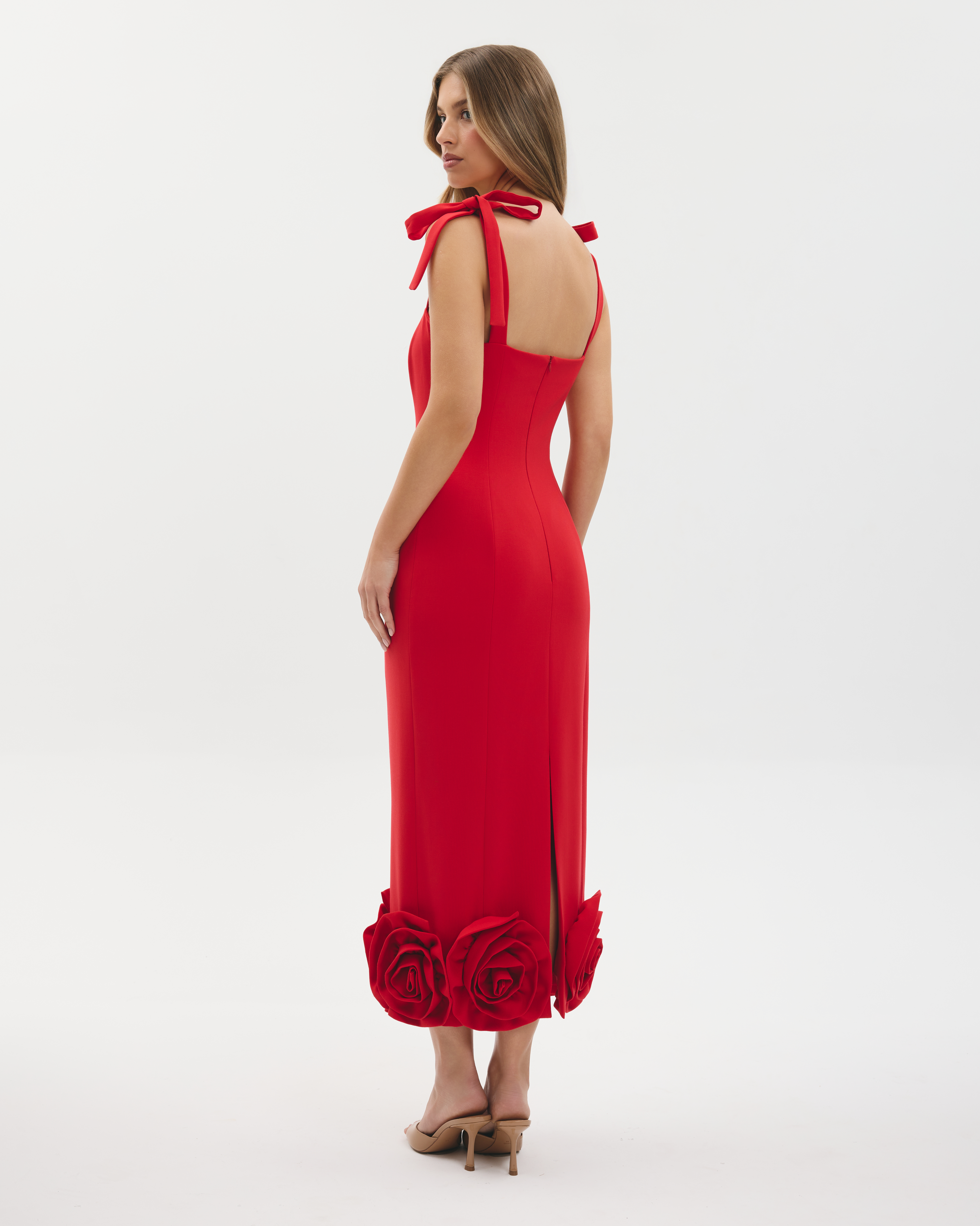 Sukienka midi o całkowicie obcisłym kroju, ozdobiona różami 3D na dole sukienki. Wykonana na podszewce, wiązana na regulowane kokardy, zapinana z tyłu na zamek błyskawiczny.