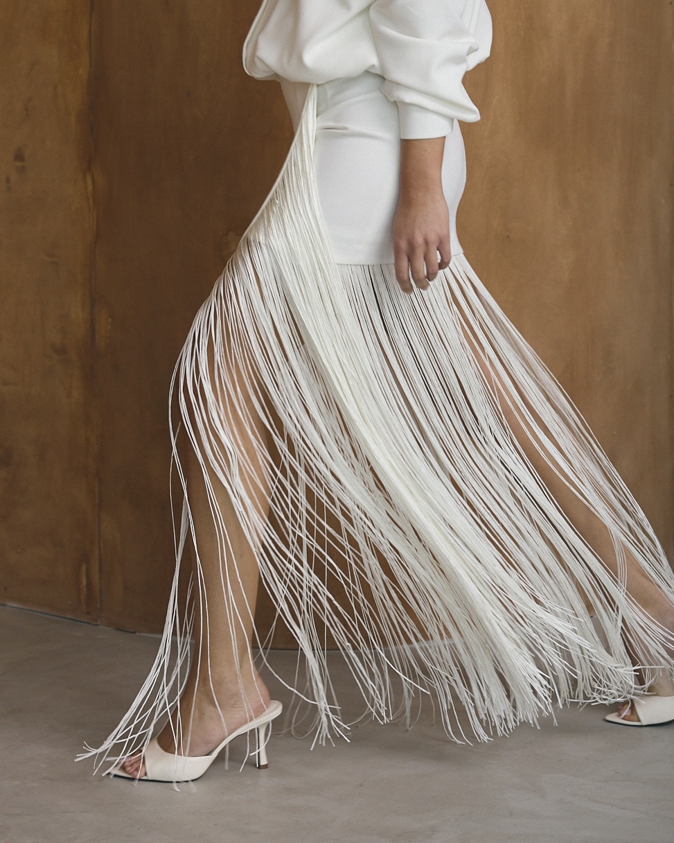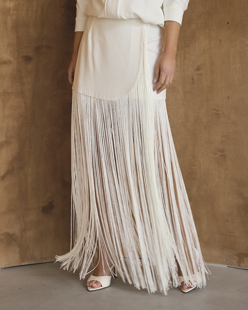 Spódnica mini w kolorze ecru, ozdobiona długimi frędzlami.