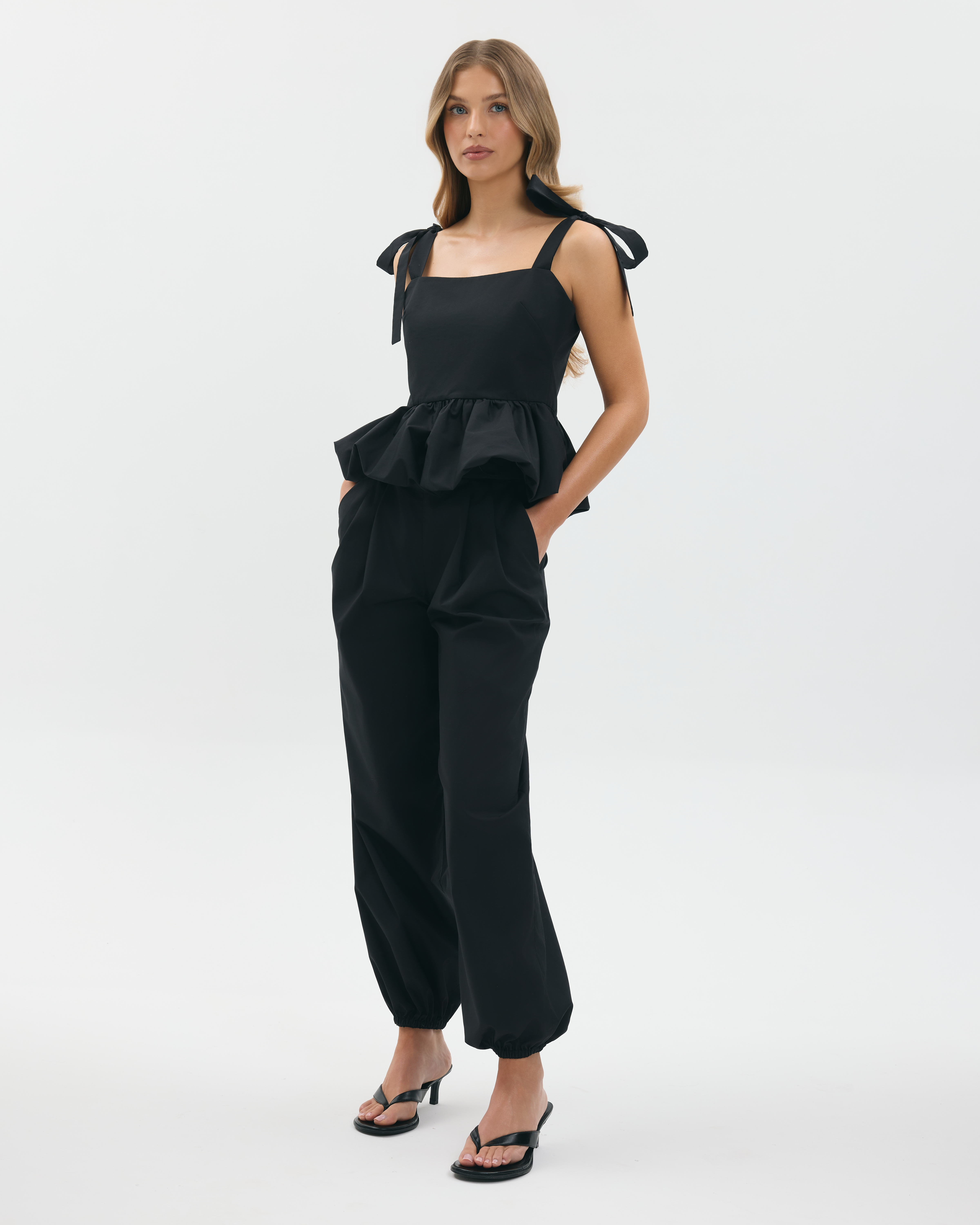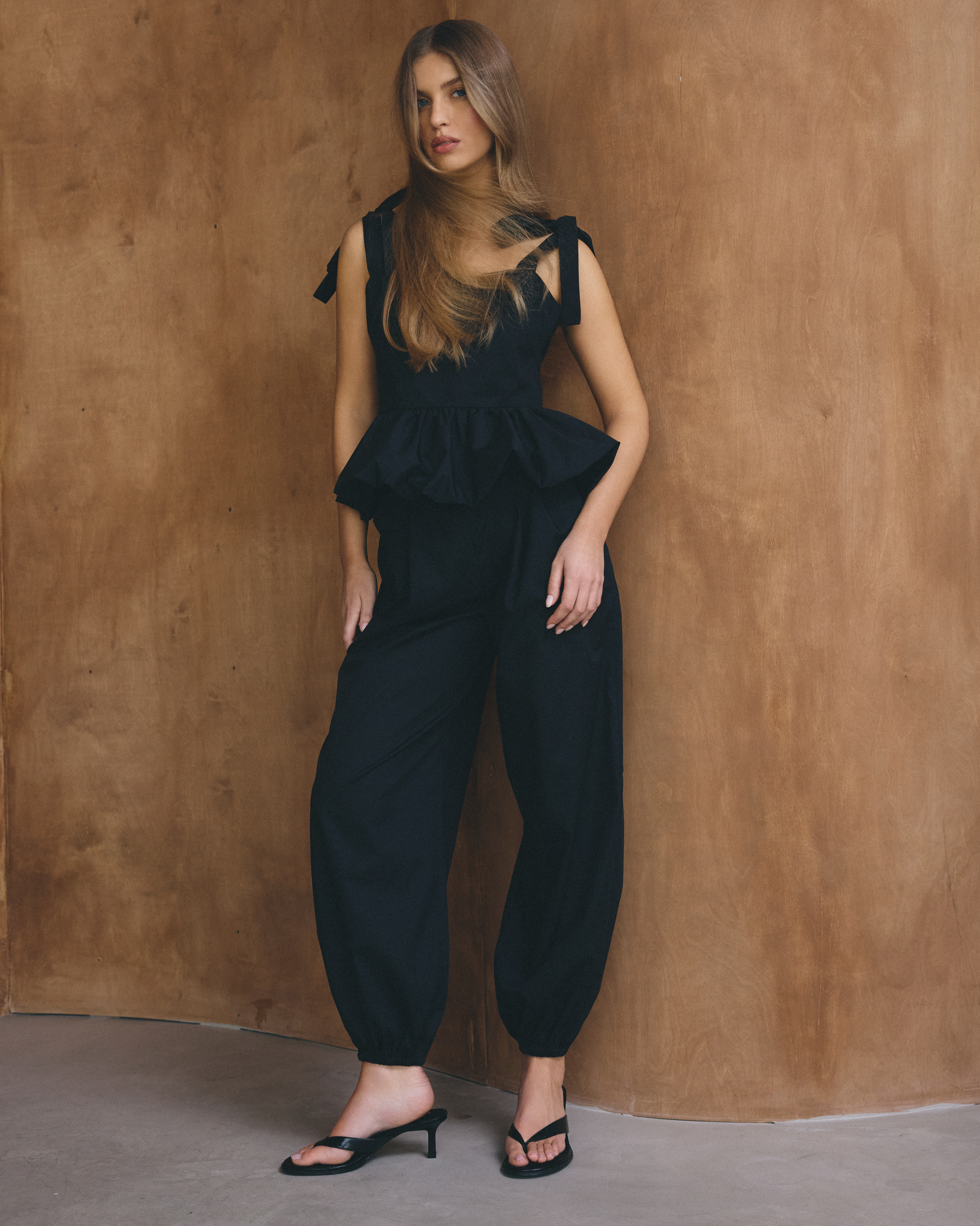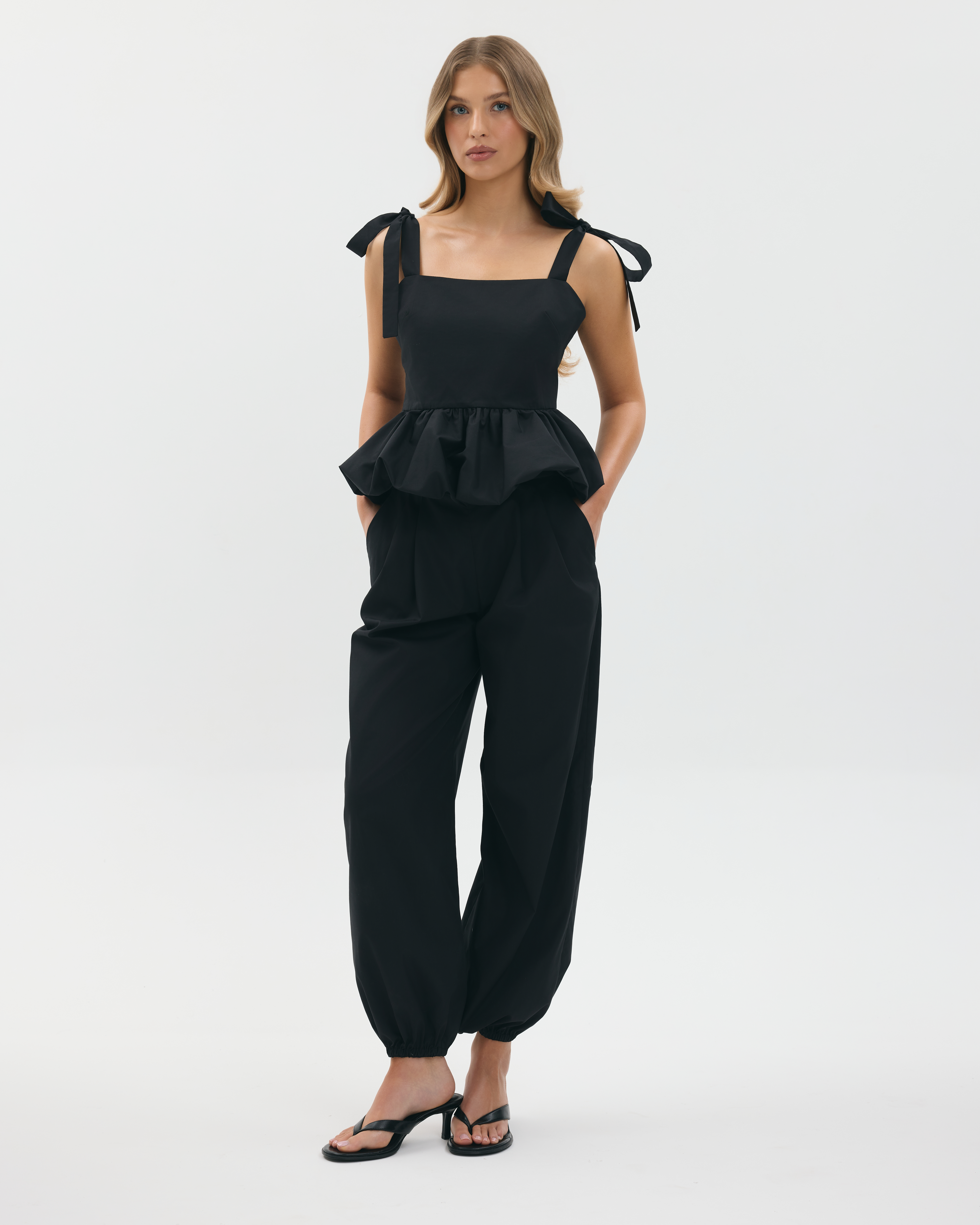 Bufiaste spodnie typu balon, wykonane z bawełny. Zapinane z boku na zamek błyskawiczny, posiadają kieszenie.
