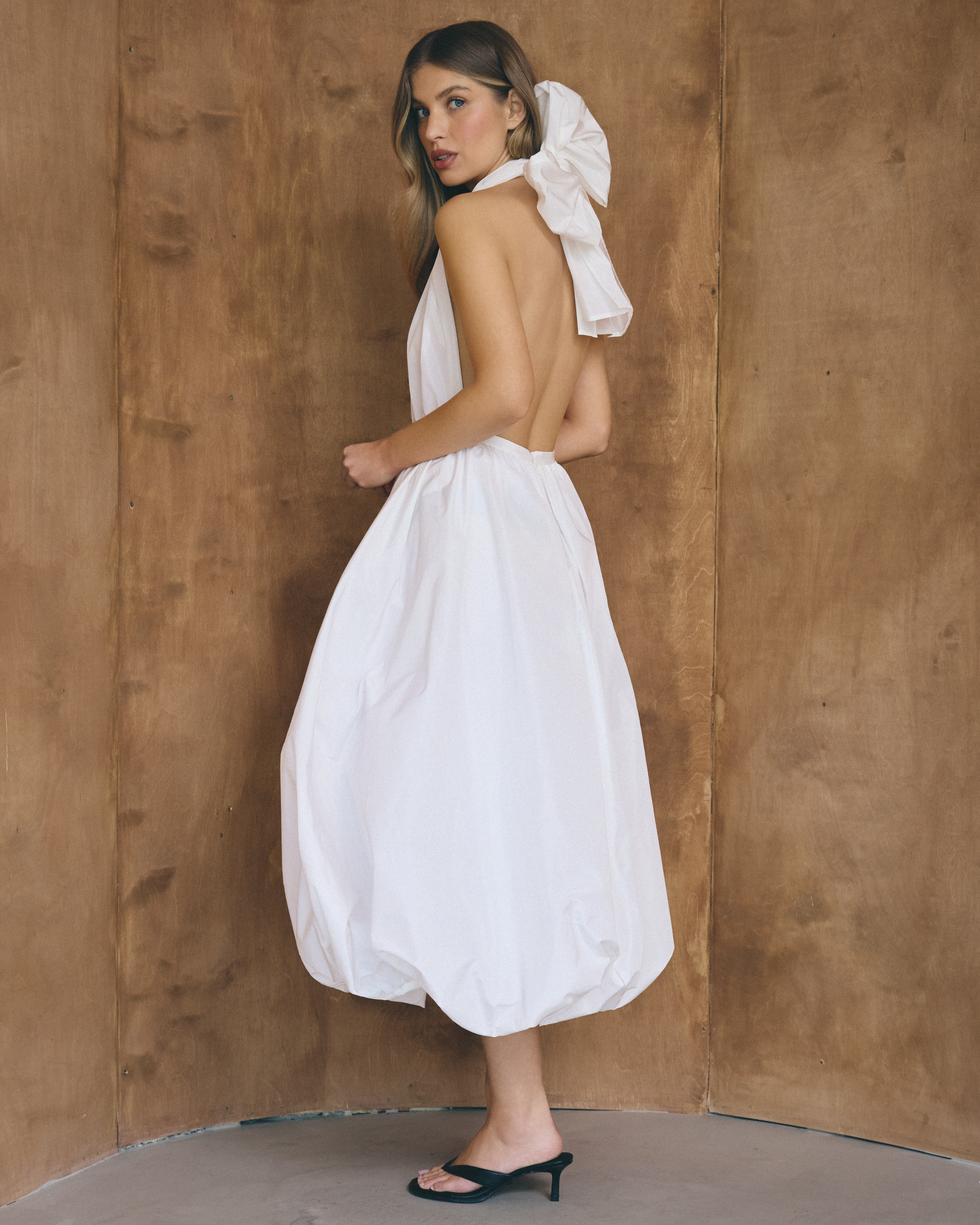 Sukienka midi o kroju bombki, wykonana z tafty. Wiązana na szyi na kokardę, zapinana z tyłu na zamek błyskawiczny.