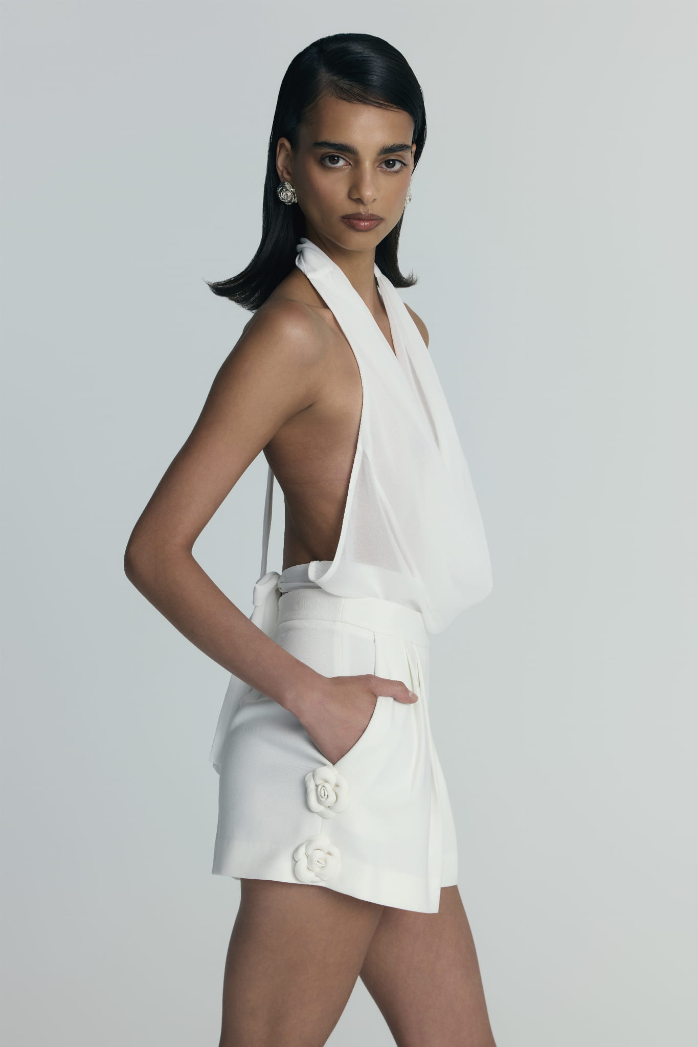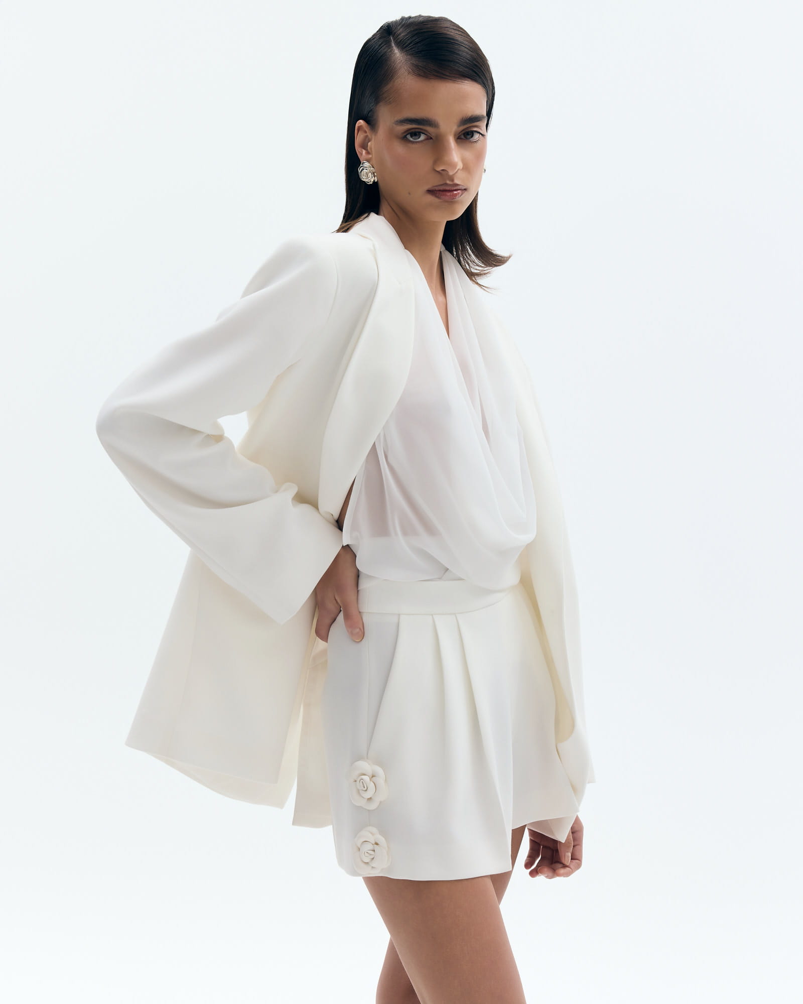 Krótkie szorty w kant o szerokim kroju, ozdobione aplikacjami w kształcie kwiatów wzdłuż bocznych szwów nogawek. Zapinane z boku na zamek błyskawiczny, posiadają kieszenie.